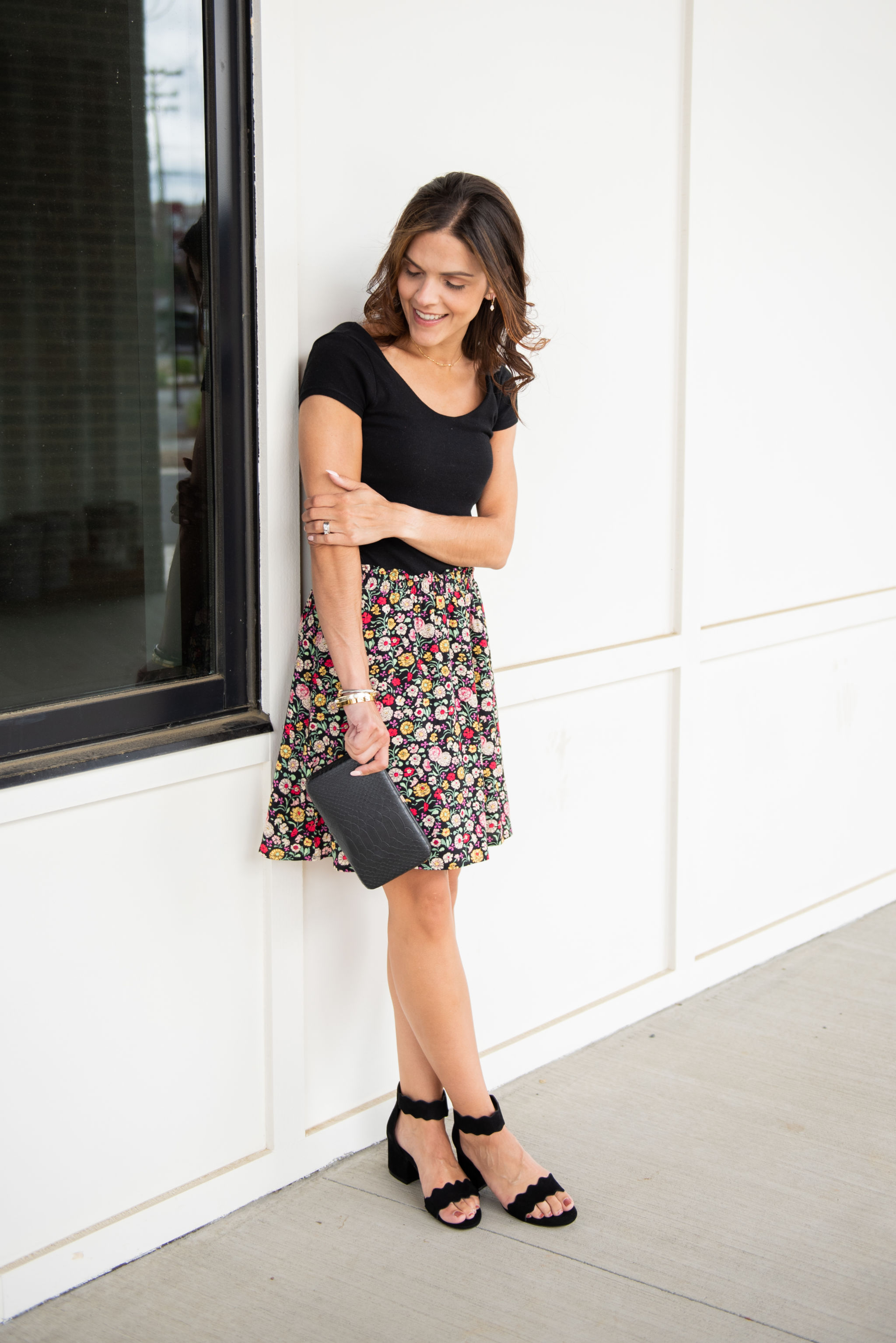 bodysuit (similar) | floral skirt | heels | denim skirt | sandals