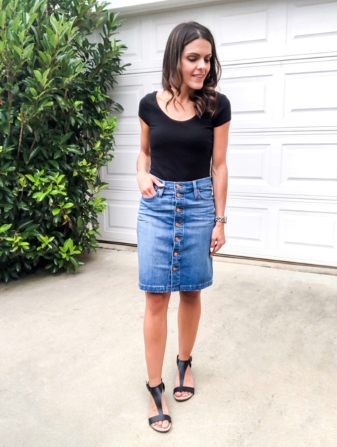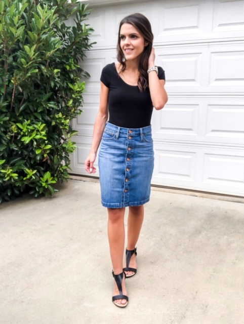 The short sleeved style is great for Summer and can be a great substitute for your dressier tops. I love styling the bodysuit with a skirt – any type really. I’ve seen it styled beautifully with denim, midi, and mini skirts! Again, it streamlines and can accentuate the prettiest of prints! This particular short sleeve I’ve had in closet for a while. I love the scoop neck, tho unseen, is carried all the way thru the back. This one is a similar fit.