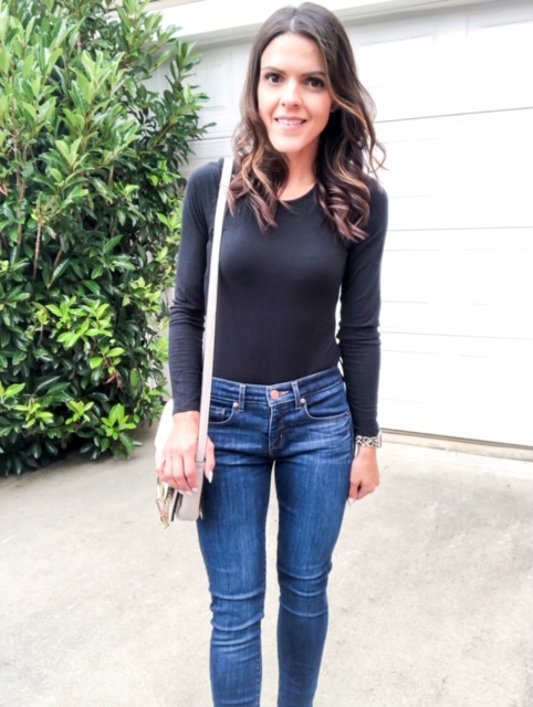 I think the long sleeve bodysuit works very well from day to night. I do not have a pair of long pant overalls, but if I did, the two would be a match. Again, it streamlines and creates any bunching of fabric. Pair your long sleeved piece with your fave pair of skinny jeans, block heels and cute bag and you have a date night look. This particular ribbed option is no longer avail, tho I’ve linked one similar here.