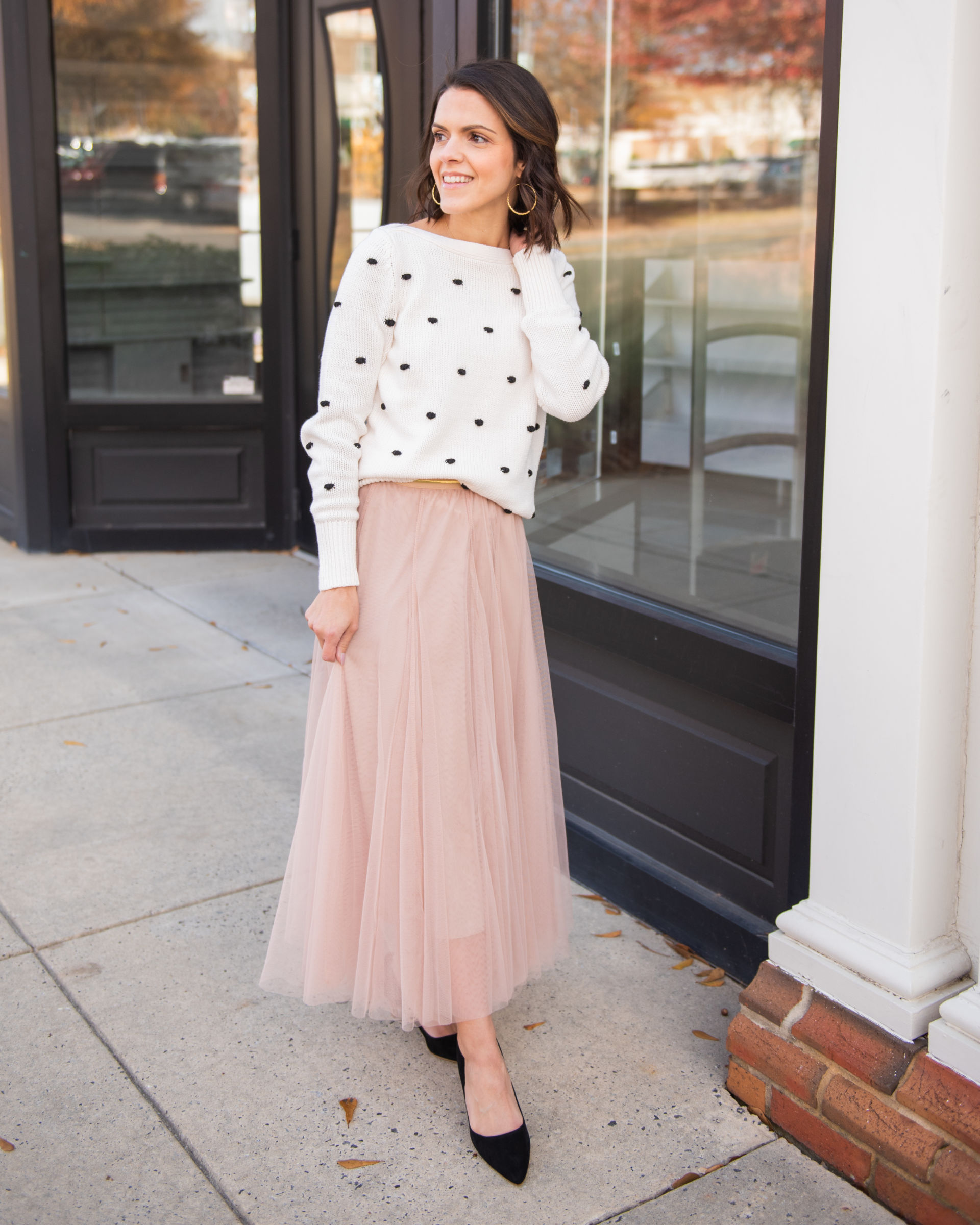 Mix textures and pair with a sweater // I shared this look when outlining Holiday party looks, and still believe it’s the perfect look for any festive occasion. Here I chose a sweater with a bit of texture to contrast with the tulle fabric. Sweaters can take spotlight in a look, so to balance the eye you can front tuck a larger sweater or choose a cropped sweater to draw an equal notice to the skirt. Such a pretty combo, don’t you think?