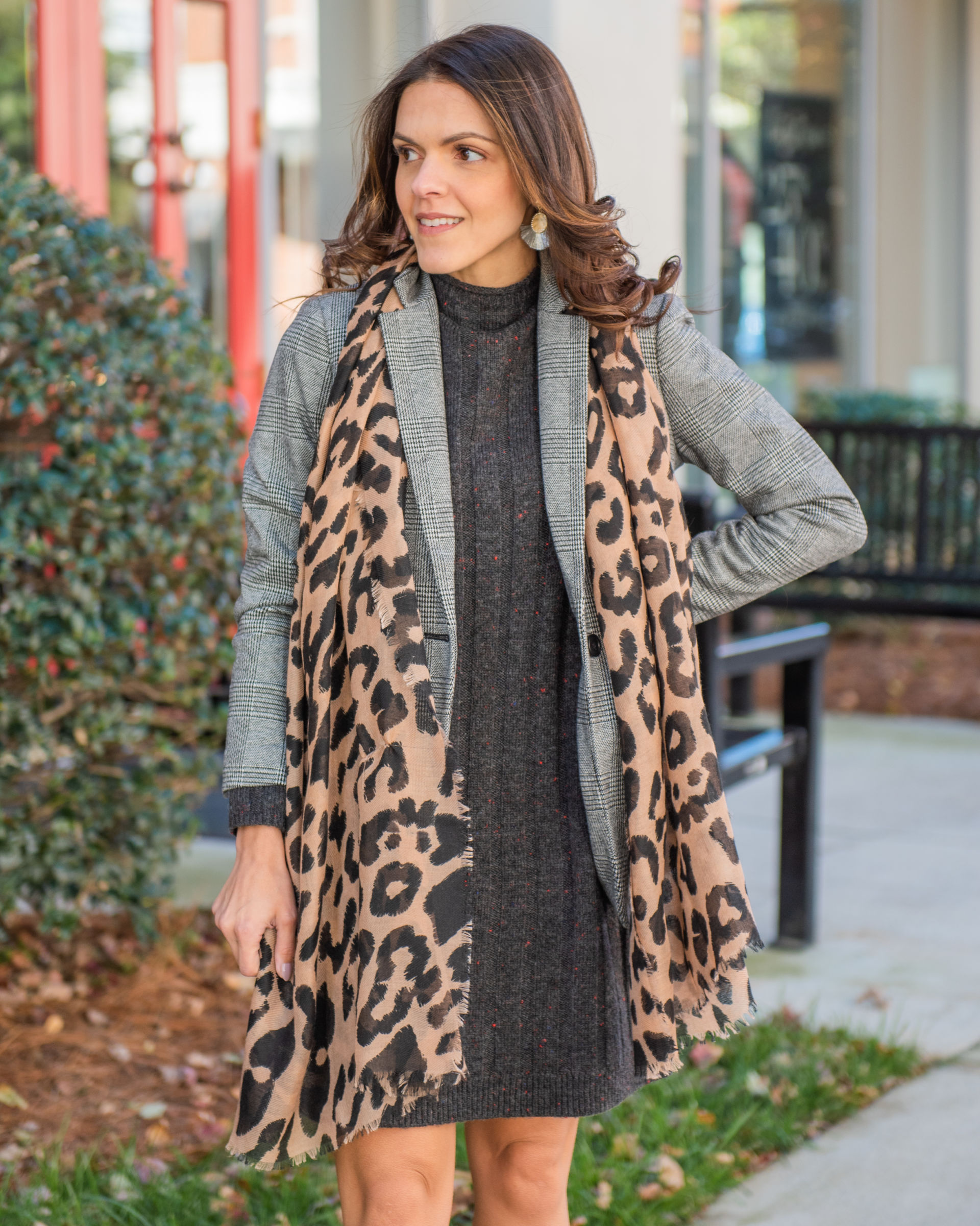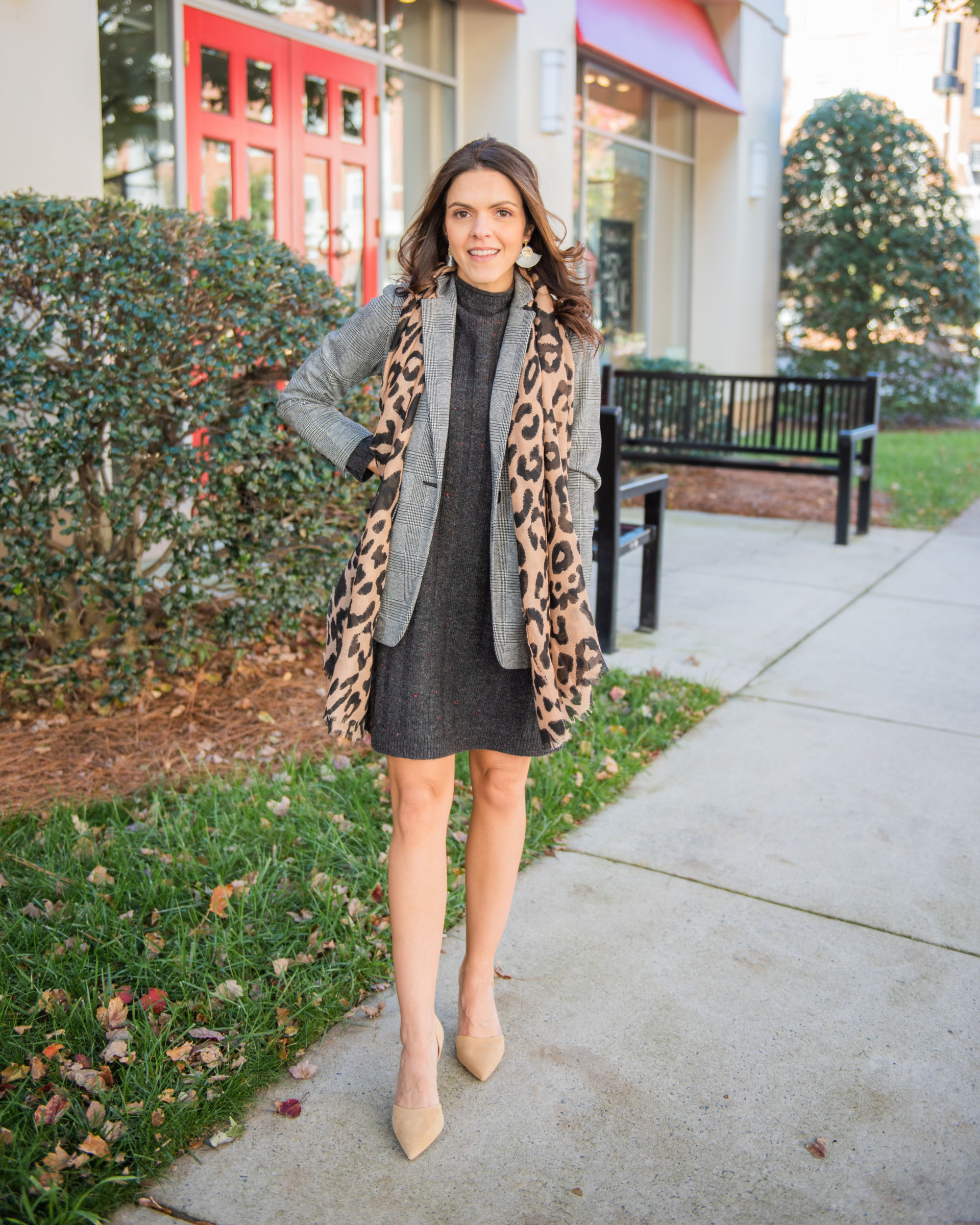This look is probably my favorite amongst all of them. It has a little of everything I love – a plaid blazer, leopard, fringe earrings, nude pumps .. mixing trends, prints, textures and everything in between is why I love the sweater dress. It provides a solid canvas to build on.
