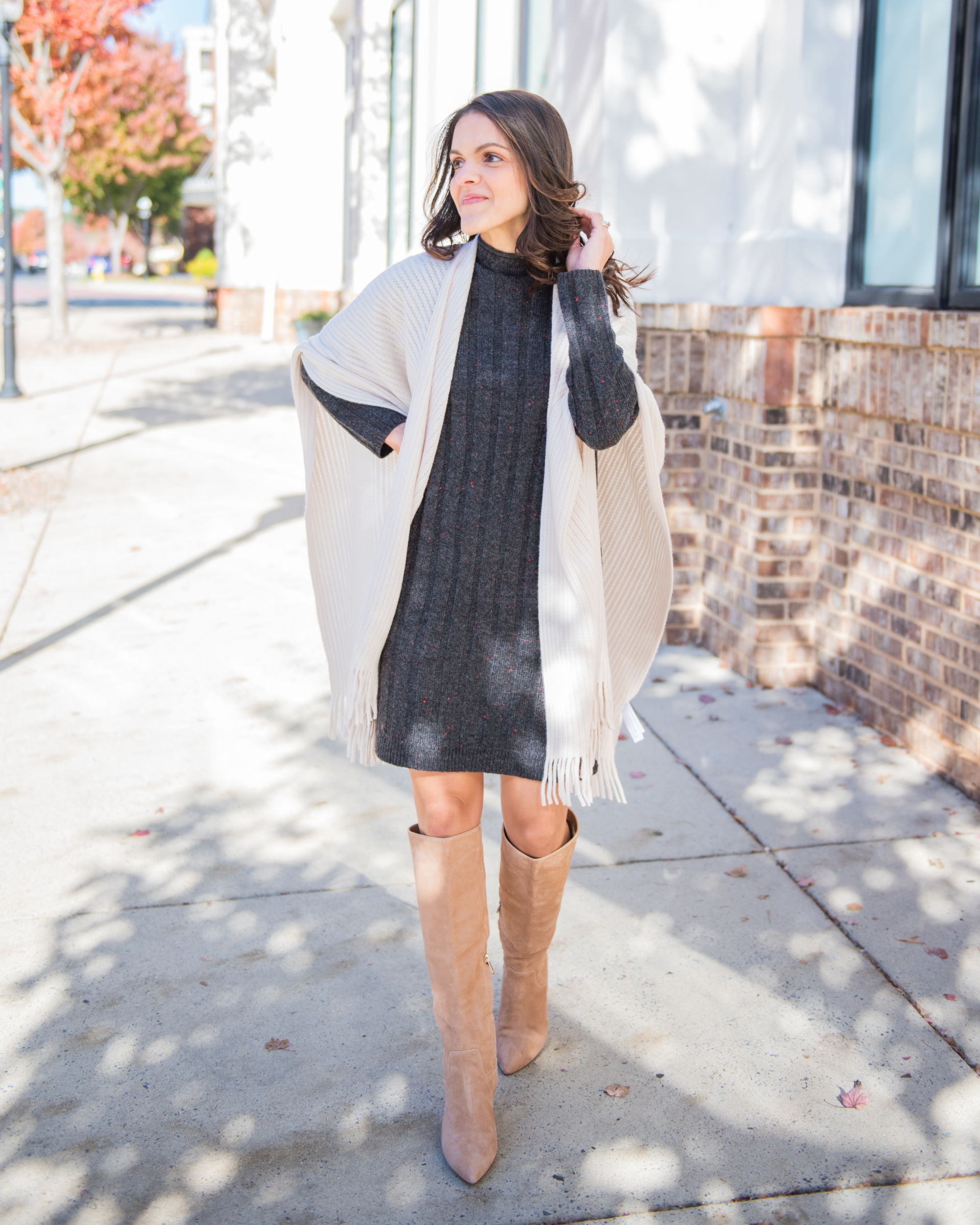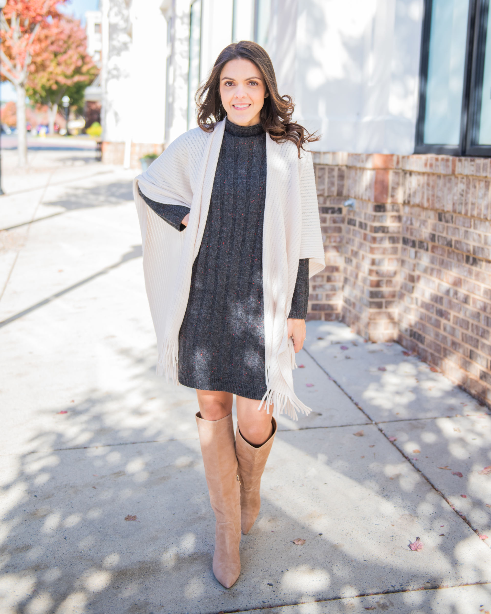 Give those fabulous knee high boots you invested in for Fall a time to shine! Here I pulled in a bit of sophisticated texture with the fringe wrap, but any shawl or cardigan will work nicely!