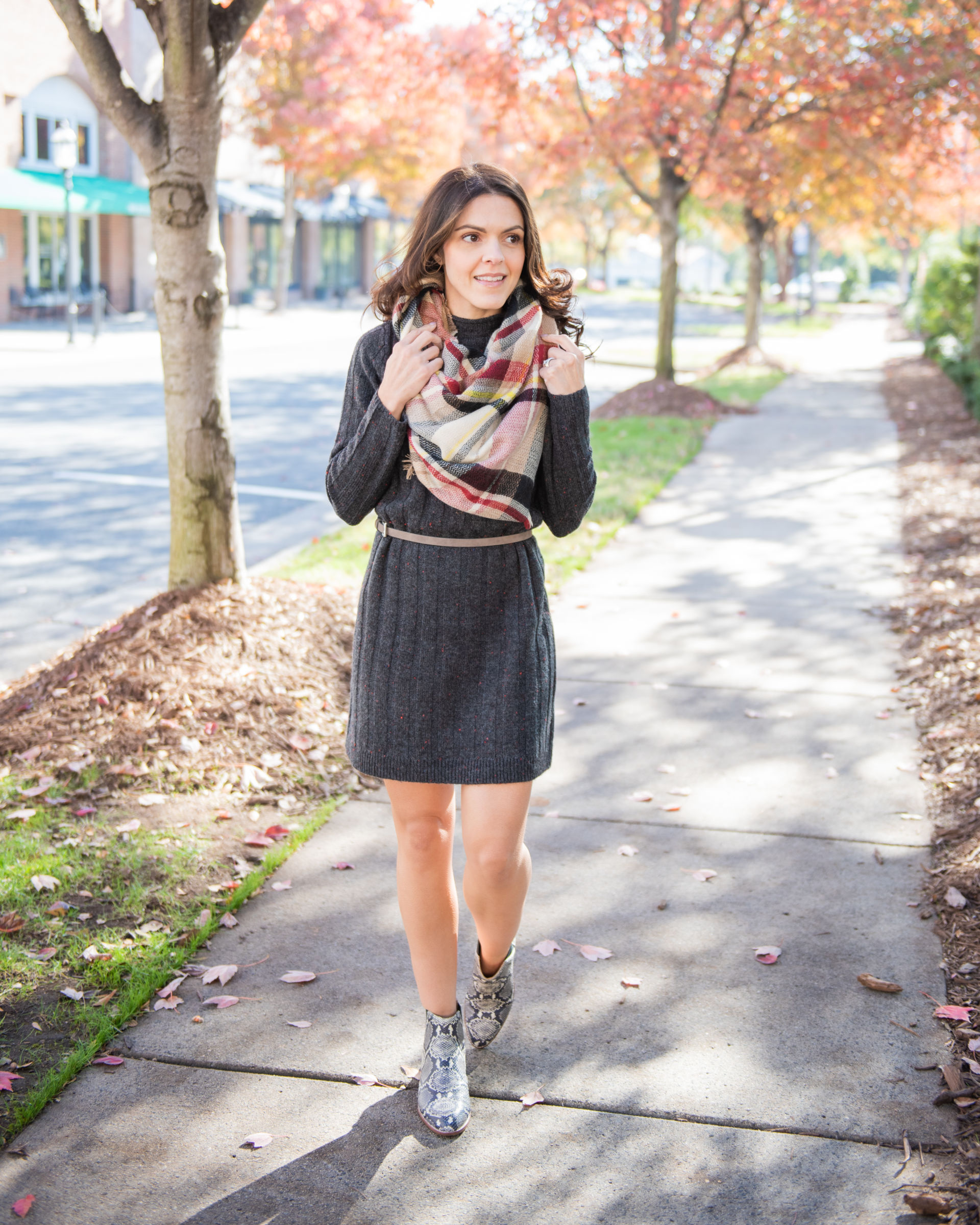 A simple scarf (see ways to style it here) or a belt will add a bit of texture and shape to your frame! Here I mixed the plaid and snake print booties to add a little edge to my look!