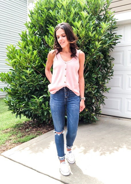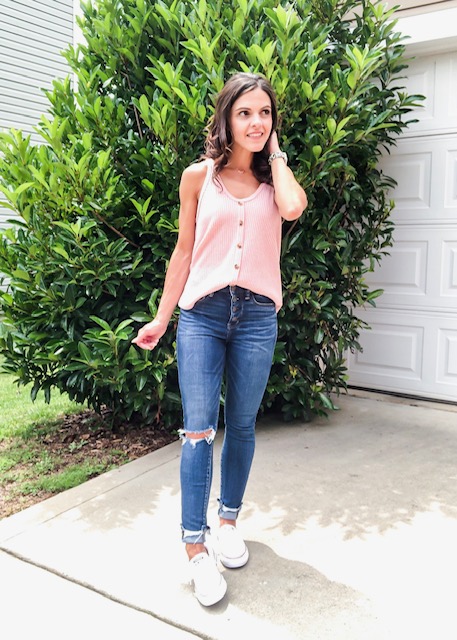 Lastly, this look right here is the classic ‘momiform’, imo. Slightly distressed, stretchy cropped jean and a soft ribbed tank. This tank is very soft, and a bit oversized – which I think is always necessary to pull off a good front tuck. The buttons down the front give it some character and keep it from looking too boring. Again, I’ve linked a similar option here. You’ve seen these cropped jeans before – still tried and true favorites. I love the classic button fly, minimal distressed knee, and cropped cuff look.