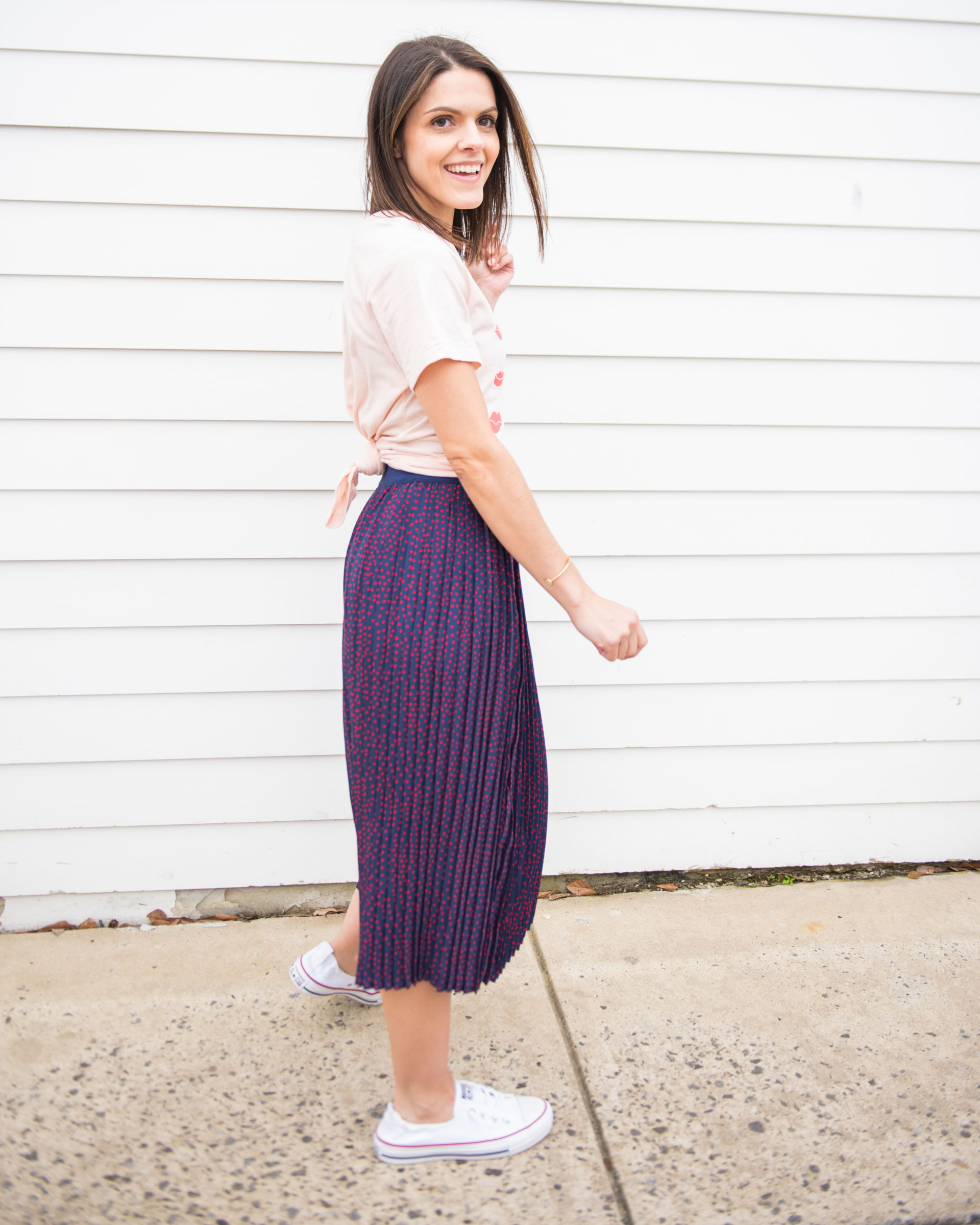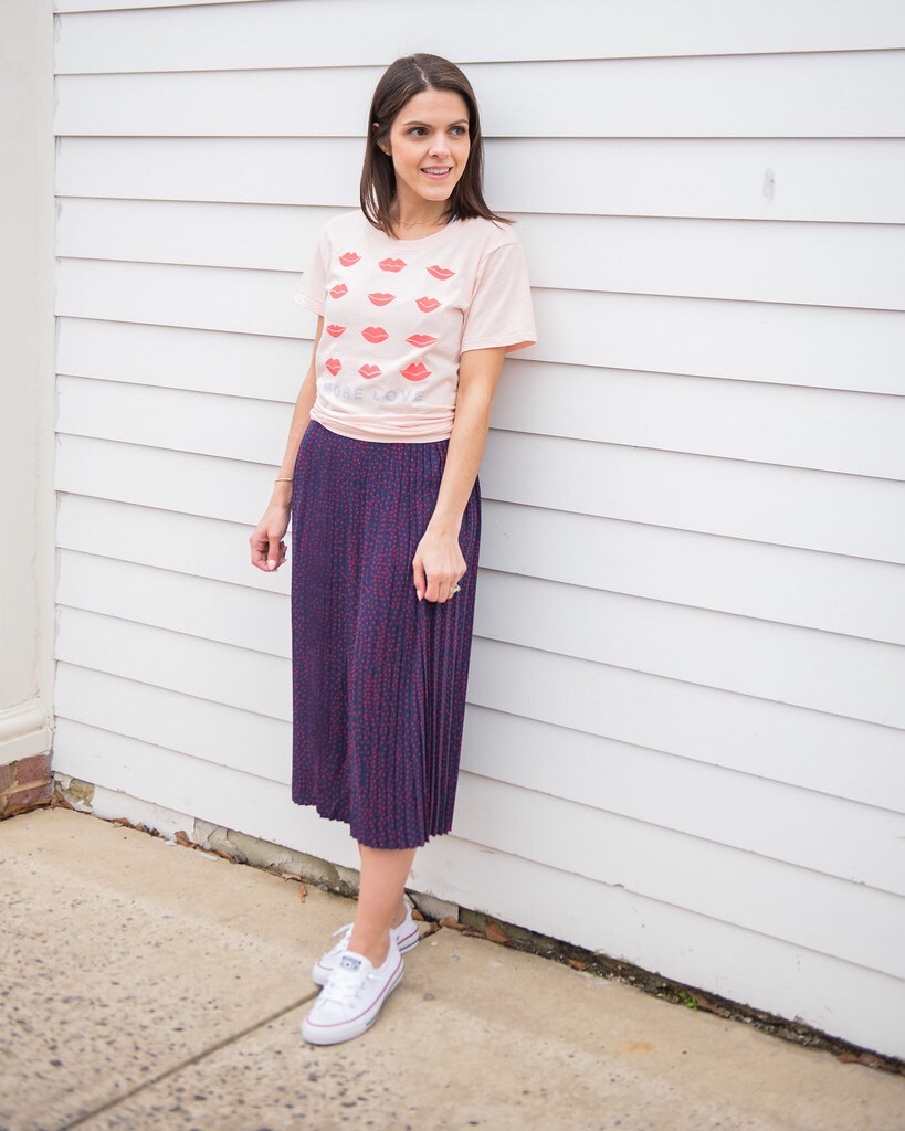 I love a good midi skirt, and I am definitely swooning over this one. The subtle heart print makes this skirt viable for wear way past Valentine’s day. For the dressier option, I pulled a few workwear items in closet. The blazer (a newfound Spring favorite), basic button up and nude heels compliment the skirt nicely. Next, you’re two steps closer to casual – just switch out the blazer for a denim jacket and pumps for boots. Lastly, utilize one of those cute graphic tees you’ve in closet, pop on your fave sneakers and boom – holiday at your leisure.