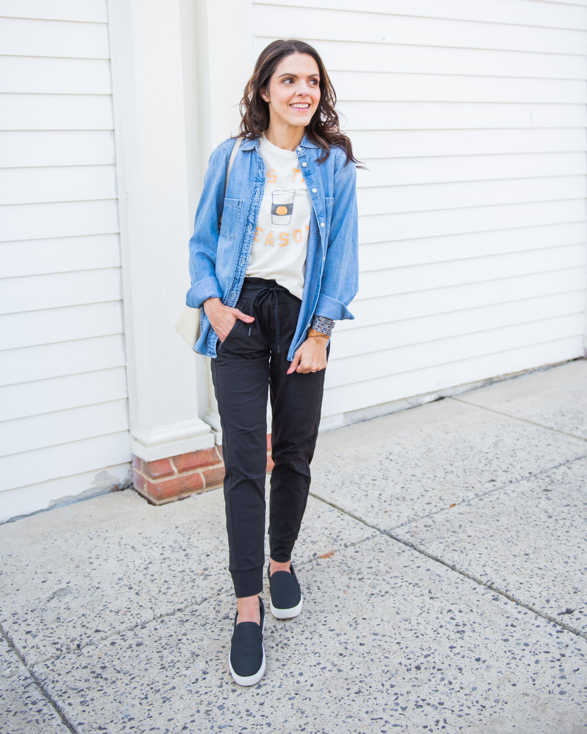 chambray shirt | hobo bag | joggers | slides | plaid button up (similar) | charcoal denim | cape | booties