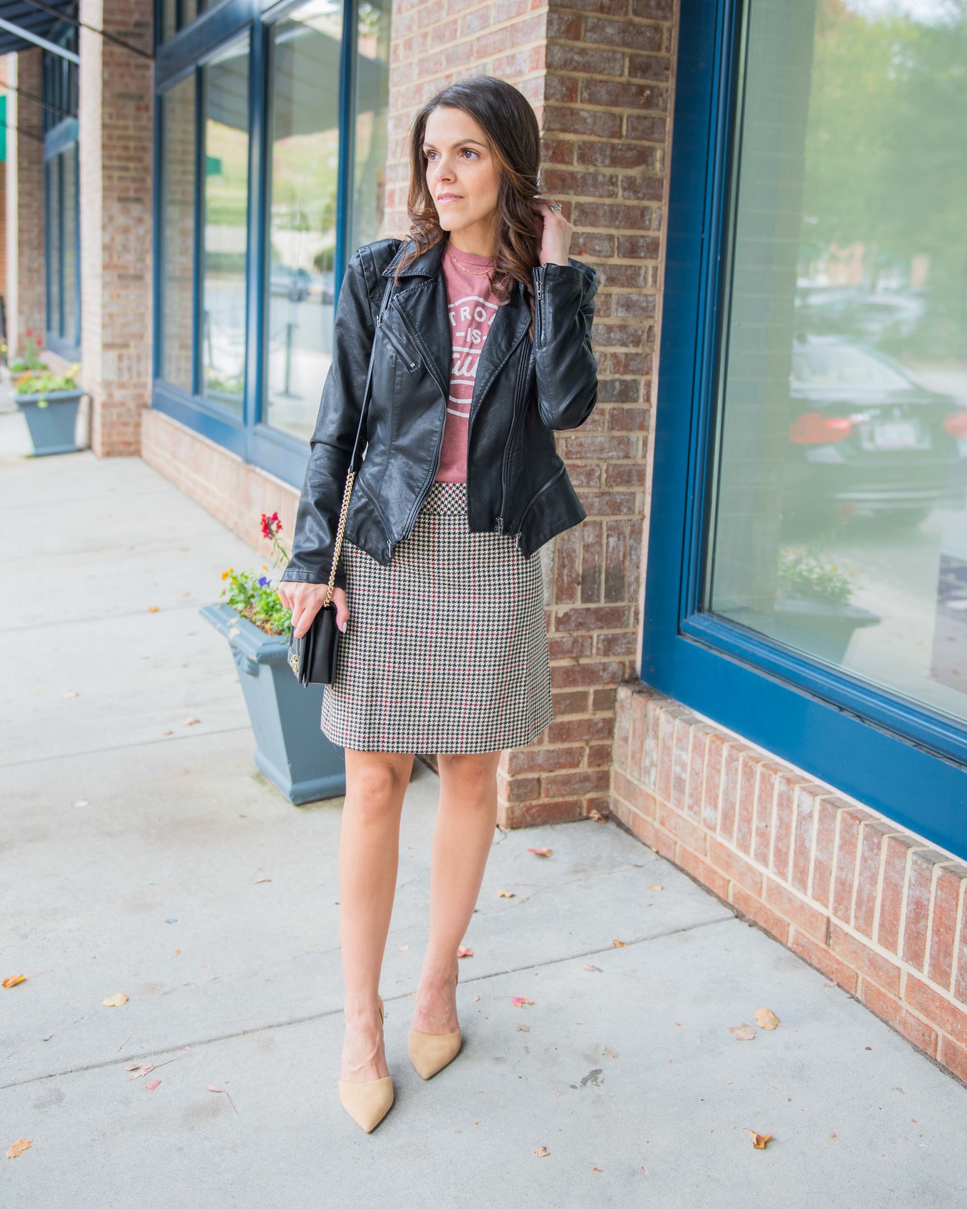 midi skirt | wedge sneakers | hobo bag | corduroy skirt | snakeskin booties | leather jacket | crossbody | houndstooth skirt | pumps