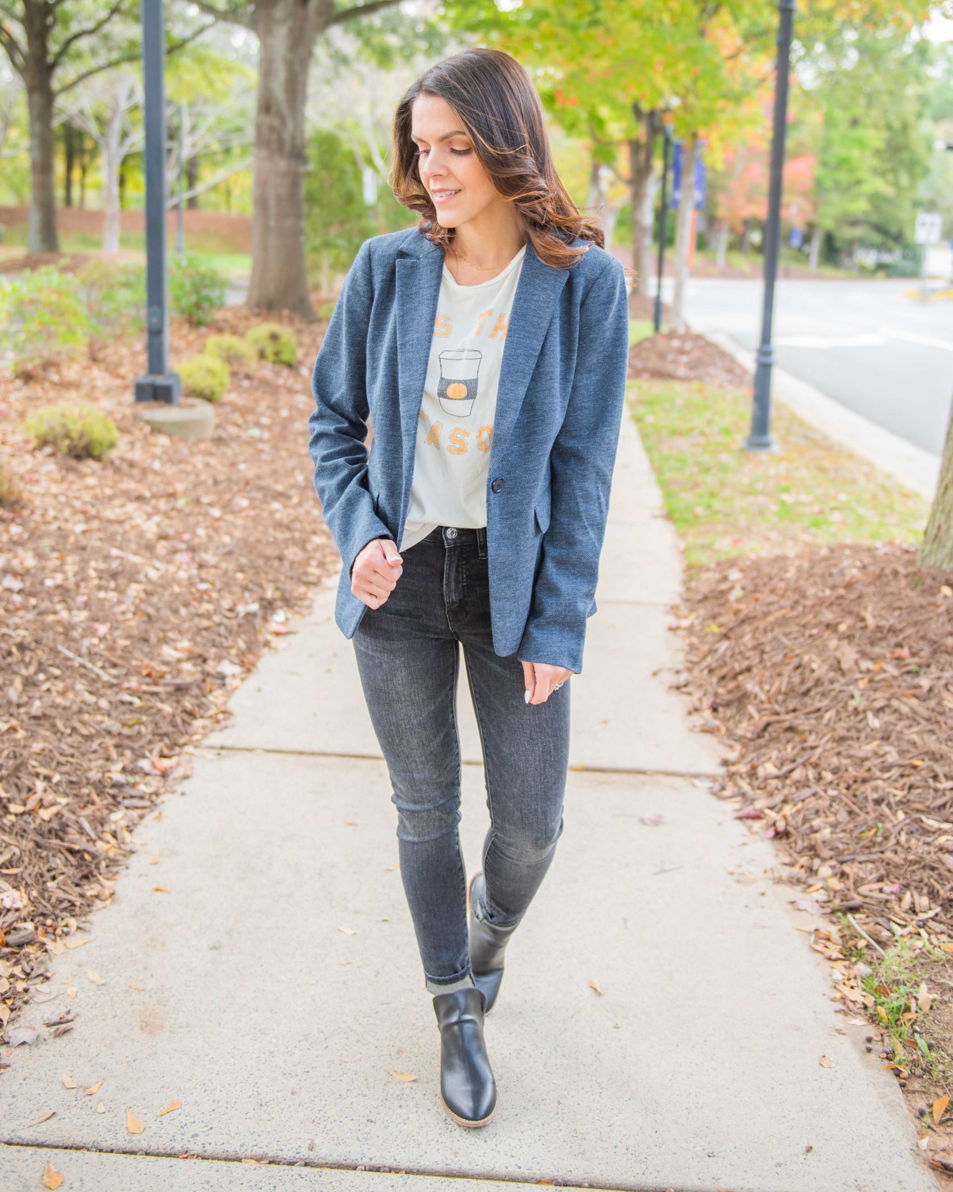 plaid blazer | Mom jean | mules | navy blazer | charcoal denim | booties | sweater blazer |