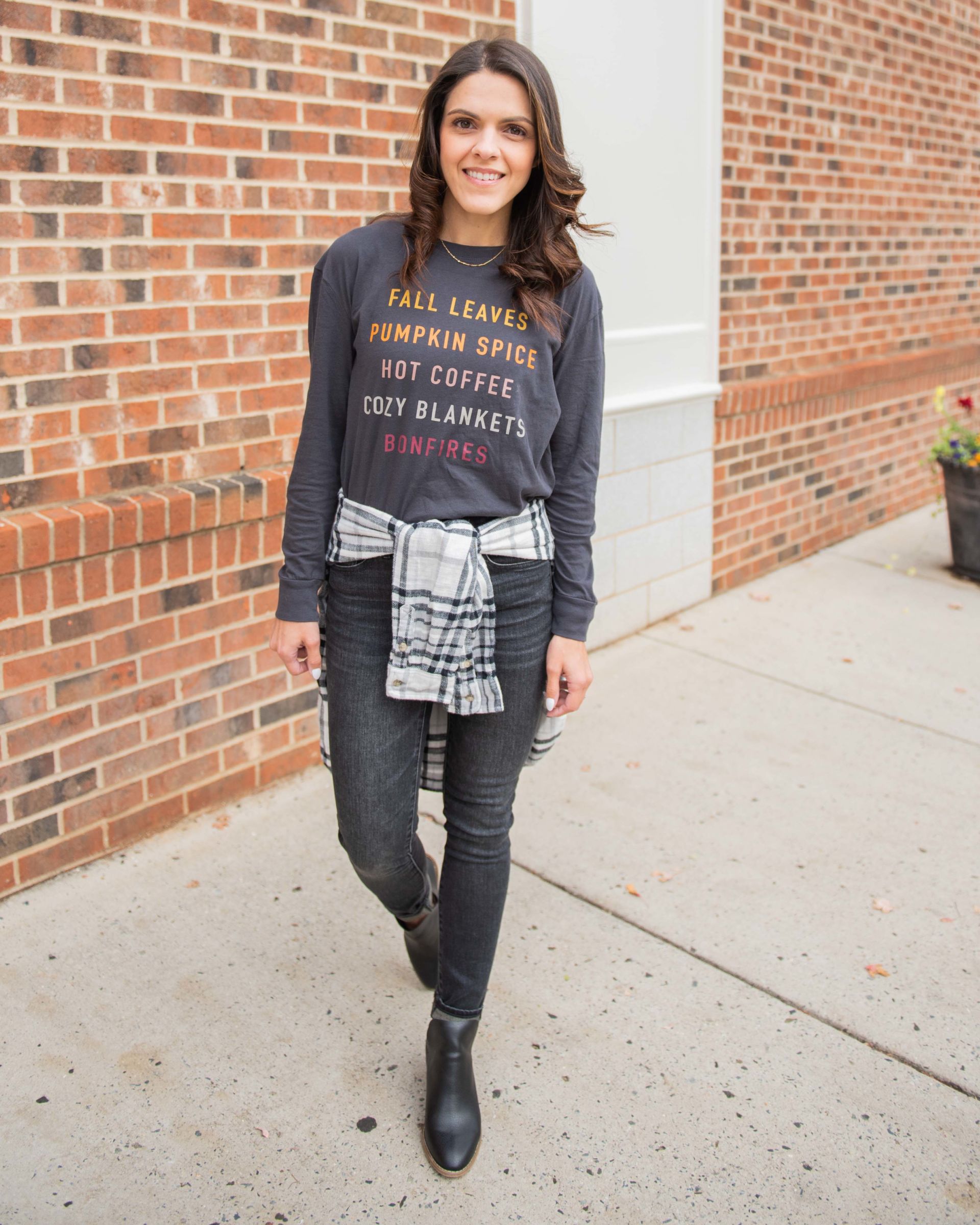 You can’t go wrong with a classic chambray top. It’s a solid go-to in my book! And tho a graphic tee is technically considered a ‘print’, don’t let that deter you from pattern play. Have some fun mixing and layering your prints! Layer that graphic tee up with a seasonal plaid for variety! To tangent that thought – plaid pairs well with anything and a graphic tee is no different! Scroll down to see how I layered with a seasonal plaid cape!