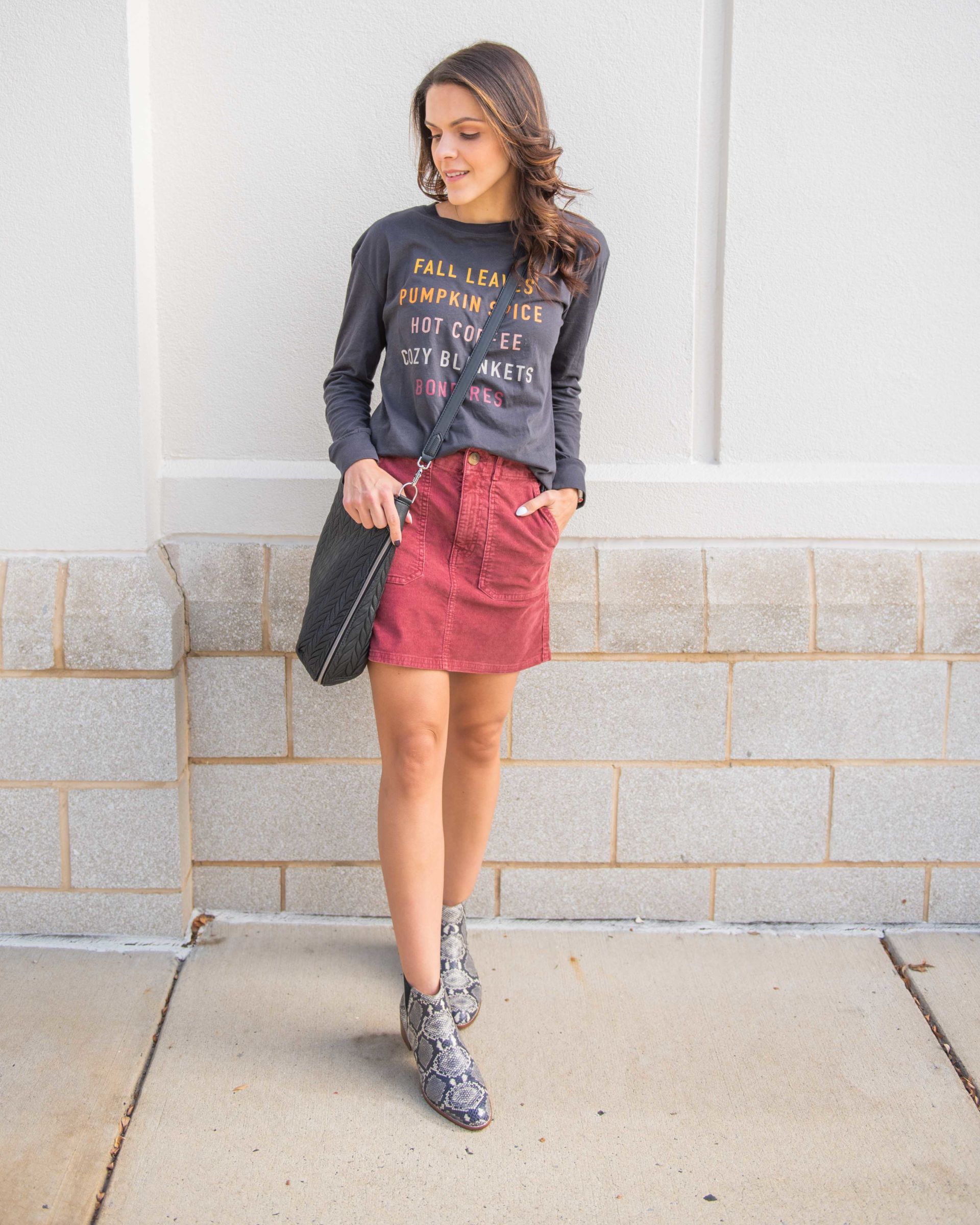 Who said a skirt had to be dressy? With all three looks below I utilized the casual vibe of the graphic tee and dressed the skirts down. I completed the midi skirt look with some cute wedged sneakers and the corduroy skirt with my favorite snake skin booties. Switch out your dressier blouse from the workday and opt in your graphic tee for an edgy happy hour look. All pieces shown fit TTS.