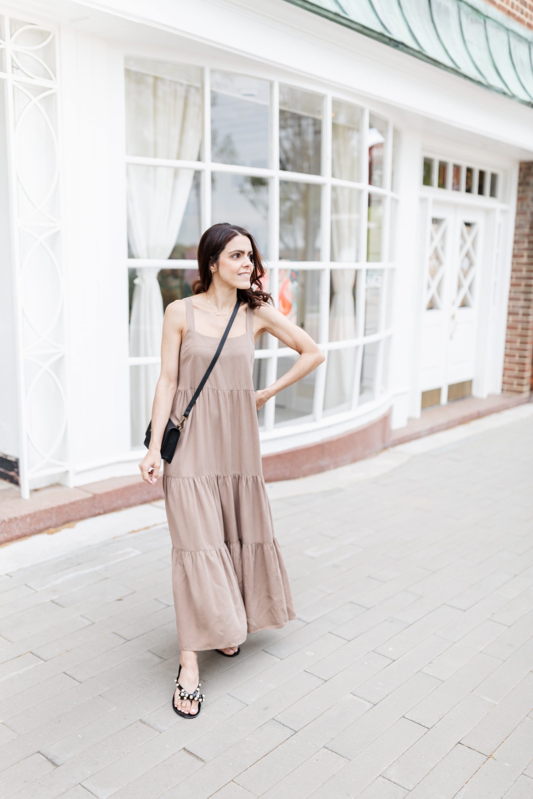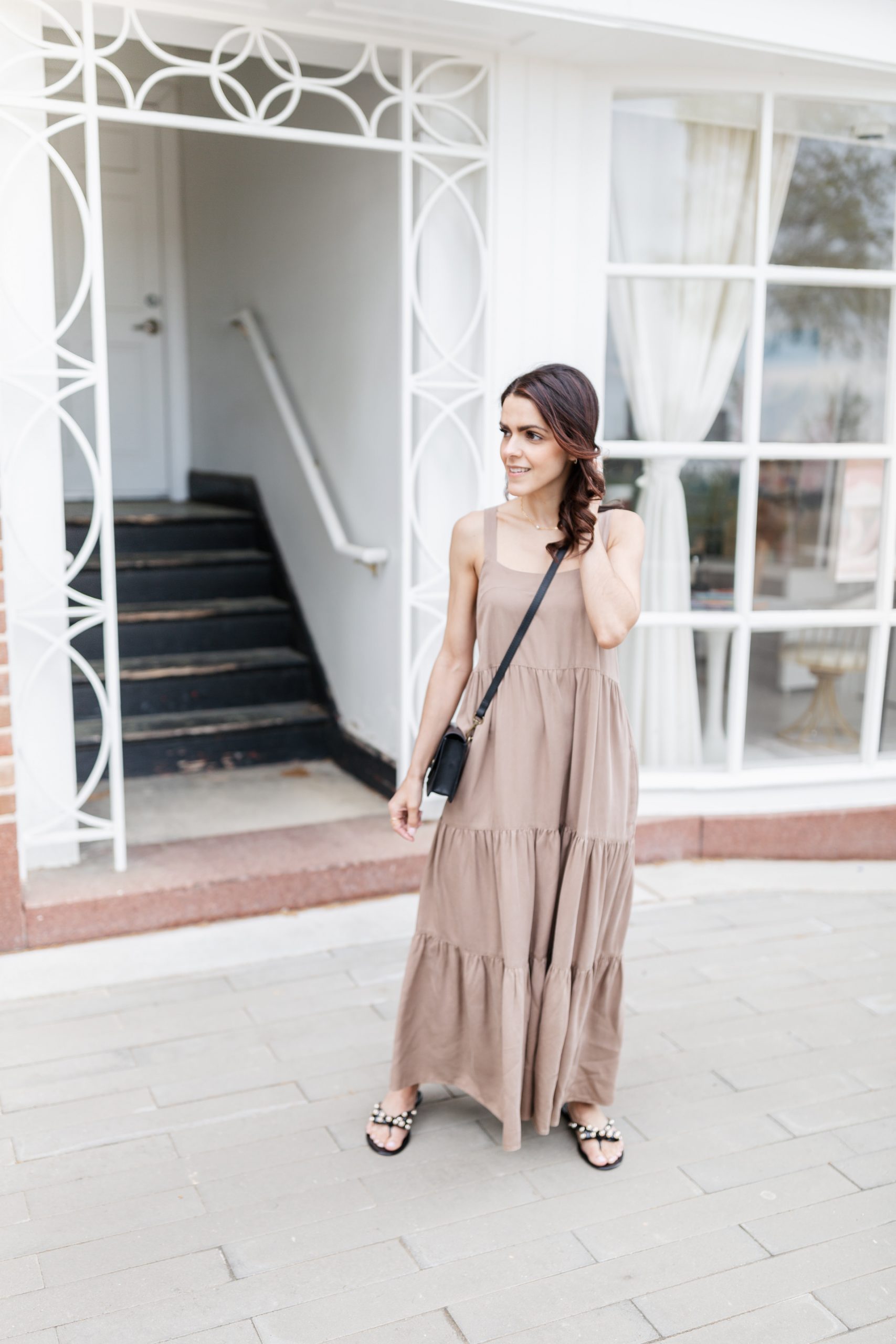 After ordering all of these items, it quickly dawned on me this haul consists of dresses, bags, and sandals. All three items I feel essential for warmer weather, don’t you? Next up is the cutest maxi dress. At only 5’2″, it’s quite difficult to find a good maxi where the dress isn’t dragging on the ground. This length is perfect and with adjustable button straps, fits tts. Here in photo I paired the dress with a black crossbody, tho shortly after this photo shoot, this adorable crochet bag arrived on doorstep. I love it and it’s currently on cue as my pool bag once that neighborhood pool opens! I finished the look with the cutest jelly pearl sandals. If in between sizes, size up.