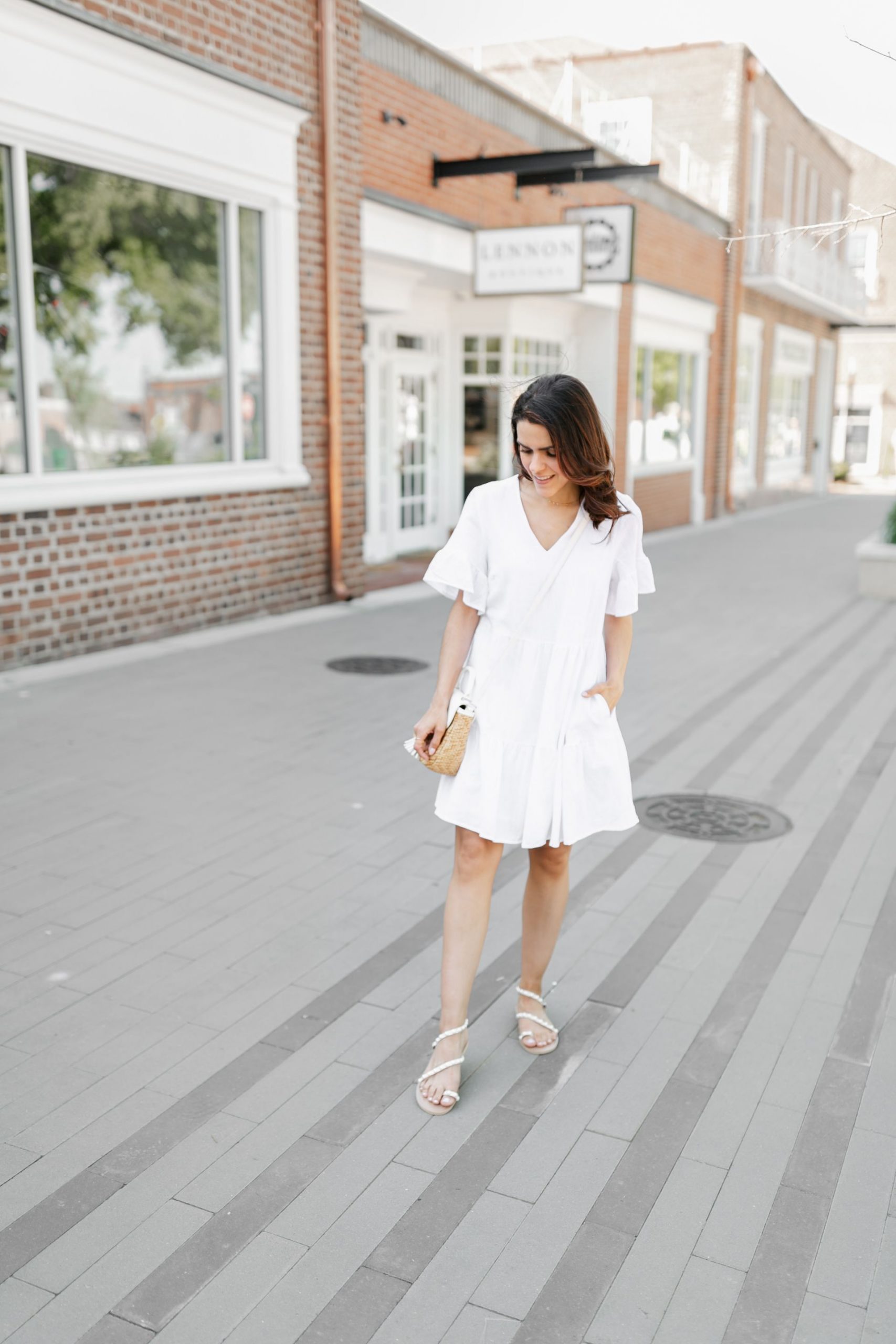 First off, this dress. Insert the swoon. If you’re in need of a LWD for Spring or Summer, this one is a great option! I love the flutter sleeves, pockets, length, and that it’s fully lined! Avail in several color options, this cute number fits tts. Pair it with cute pearl strap sandals and a pretty rattan crossbody bag (also similar) and you’ll be set!