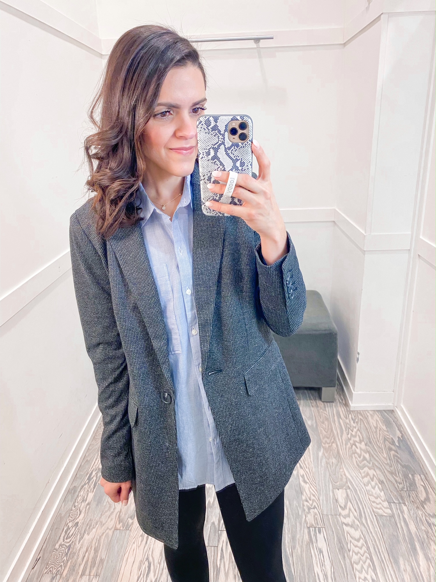 houndstooth long knit blazer (2P) | pinstripe tunic shirt (SP) | high waist sculpt leggings (SP)